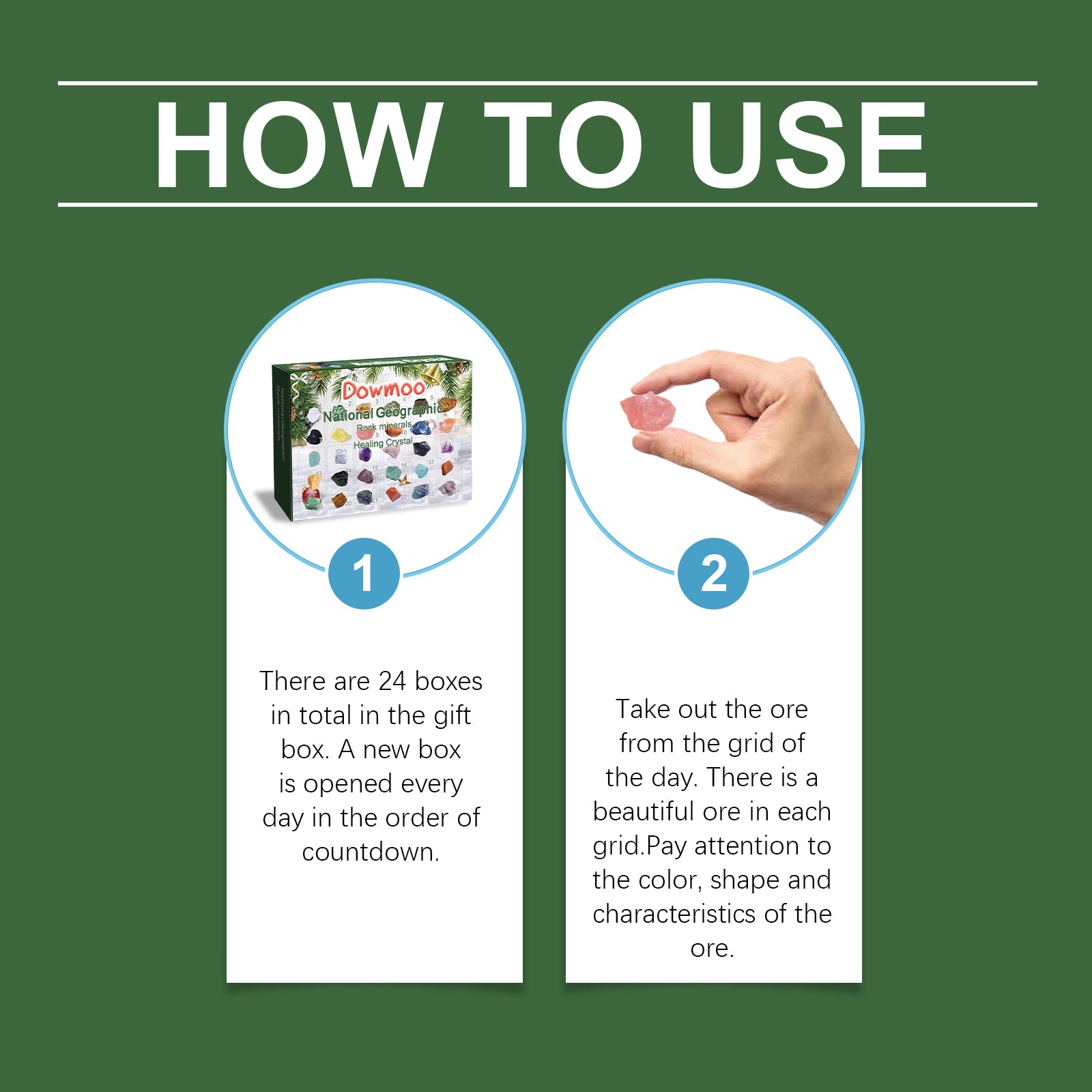 Our 24 cell ore gift box blind box contains ore. It can increase personal interaction time and share the joy of discovery together. How to use it is simple: there are 24 boxes in the gift box. Each day a new box is opened in a countdown sequence to remove the ore from the daily grid. Inside each cell is a beautiful mineral. Pay attention to the color, shape and characteristics of the ore. And can be entertaining to increase the children's geological knowledge.