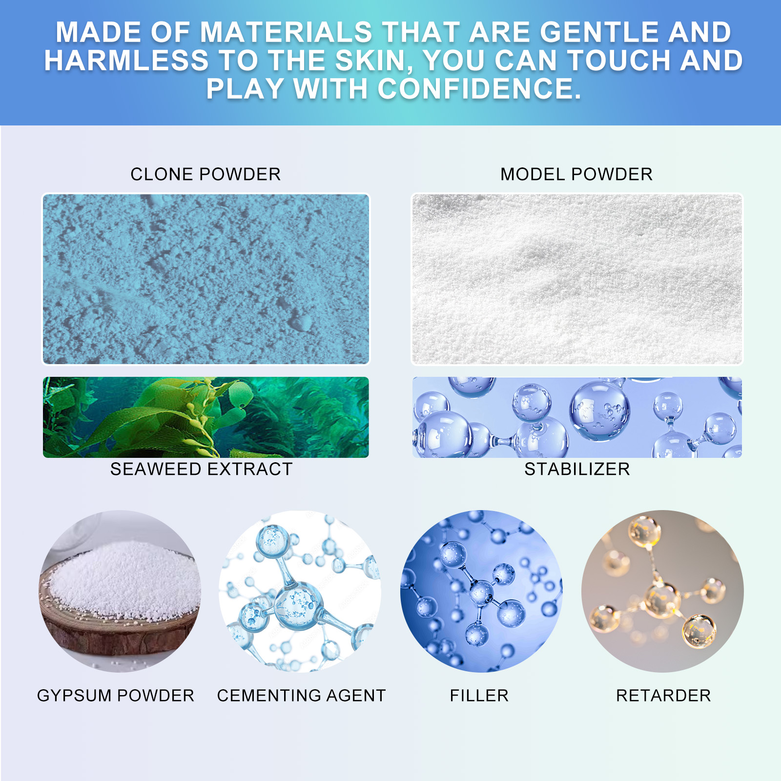 Our 3D hand-crafted memorial models contain seaweed extract, plaster powder and binder. It can make models of hands or feet, leave precious memories, and become the material carrier of memories. Its use is simple: Add the clone powder and water to the bucket, stir well with a mixing stick, put your hand in the solution, wait 3-5 minutes to color and set, then gently shake your hand and pull it out, stir the molding powder and water well, pour the mixture into the mold, pat the side of the bucket to reduce bubbles, wait more than 30 minutes for the model to set, then carefully peel off the clone layer. Finally, the surface of the model is sanded to make it smooth and can be colored with gold and silver powder as needed. And can memorialize the model.