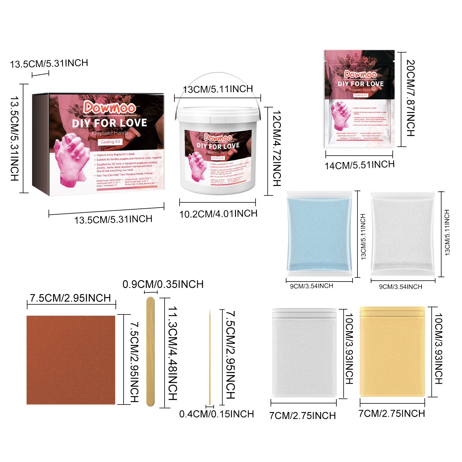 Our couple hand model diy hand model contains sodium alginate. It can record the growth process, fine capture every fine line and fingerprint, so that you create a more perfect product, is a kind of love witness. It is simple to use: add the clone powder and water in a bucket with a mixing stick, stir it evenly, put your hand in the solution for 3-5 minutes, let it change color and set, then gently shake your hand and take it out. Add the molding powder and water to another bucket and mix well with a mixing stick. Pour the mixture into the mold and pat the edge of the bucket to reduce air bubbles. Wait for more than 30 minutes to cure before peeling off the clone layer. After peeling, process and color with sandpaper as needed. Perfect for teens, adults, couples and friends to create priceless memories together, it's a great choice for gift-giving.