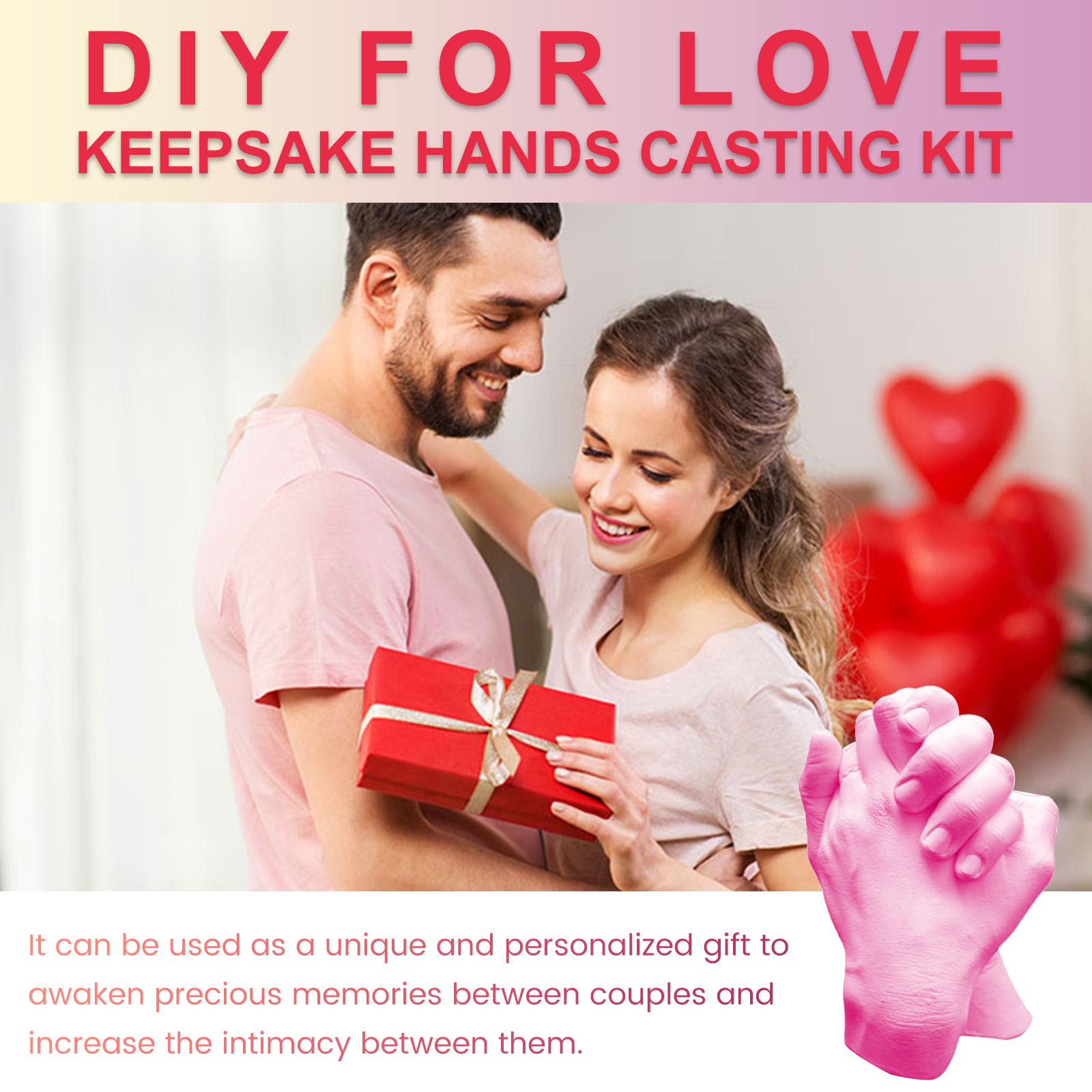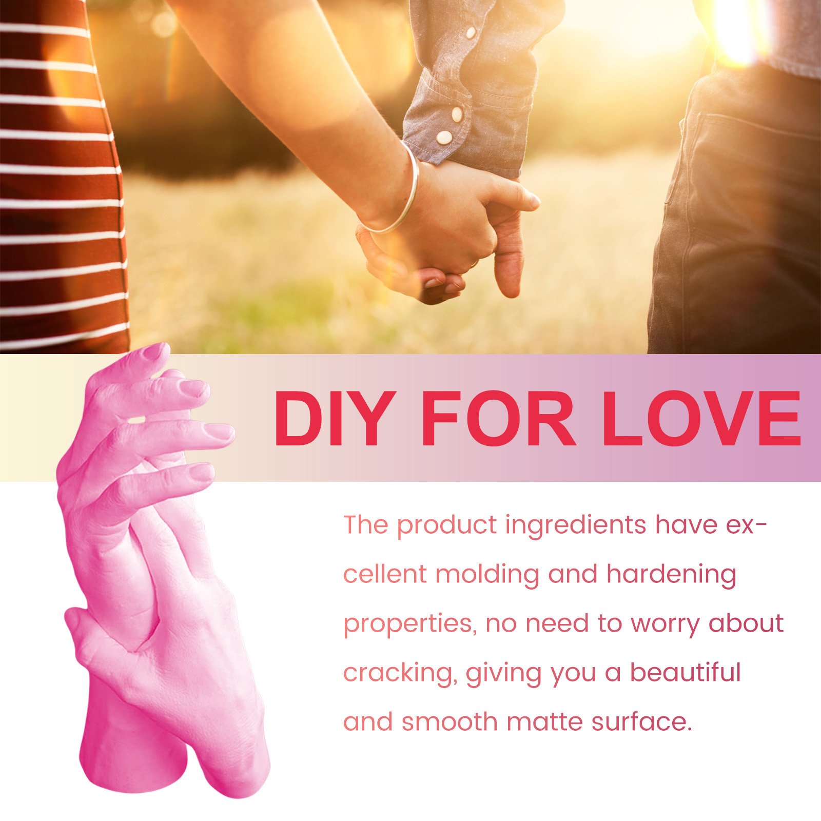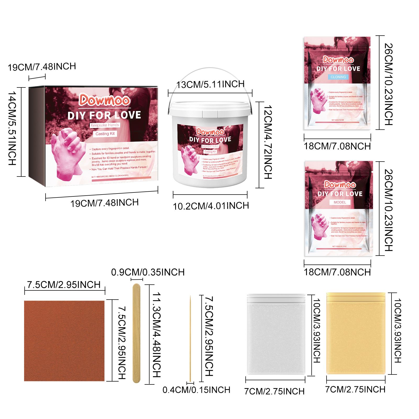 Our couple hand model diy hand model contains sodium alginate. It can record the growth process, fine capture every fine line and fingerprint, so that you create a more perfect product, is a kind of love witness. The way to use it is simple: add the clone powder and water in a bucket, mix it evenly with a mixing stick, put your hand in the solution and wait 3-5 minutes for it to change color and set, then gently shake your hand and take it out. Add the molding powder and water to another bucket and mix well with a mixing stick. Pour the mixture into the mold and tap the edge of the bucket to reduce air bubbles. Wait for more than 30 minutes, cure before peeling off the clone layer. After peeling off, sandpaper and color as needed. Perfect for teens, adults, couples and friends to create priceless memories together, it's a great choice for gift-giving.