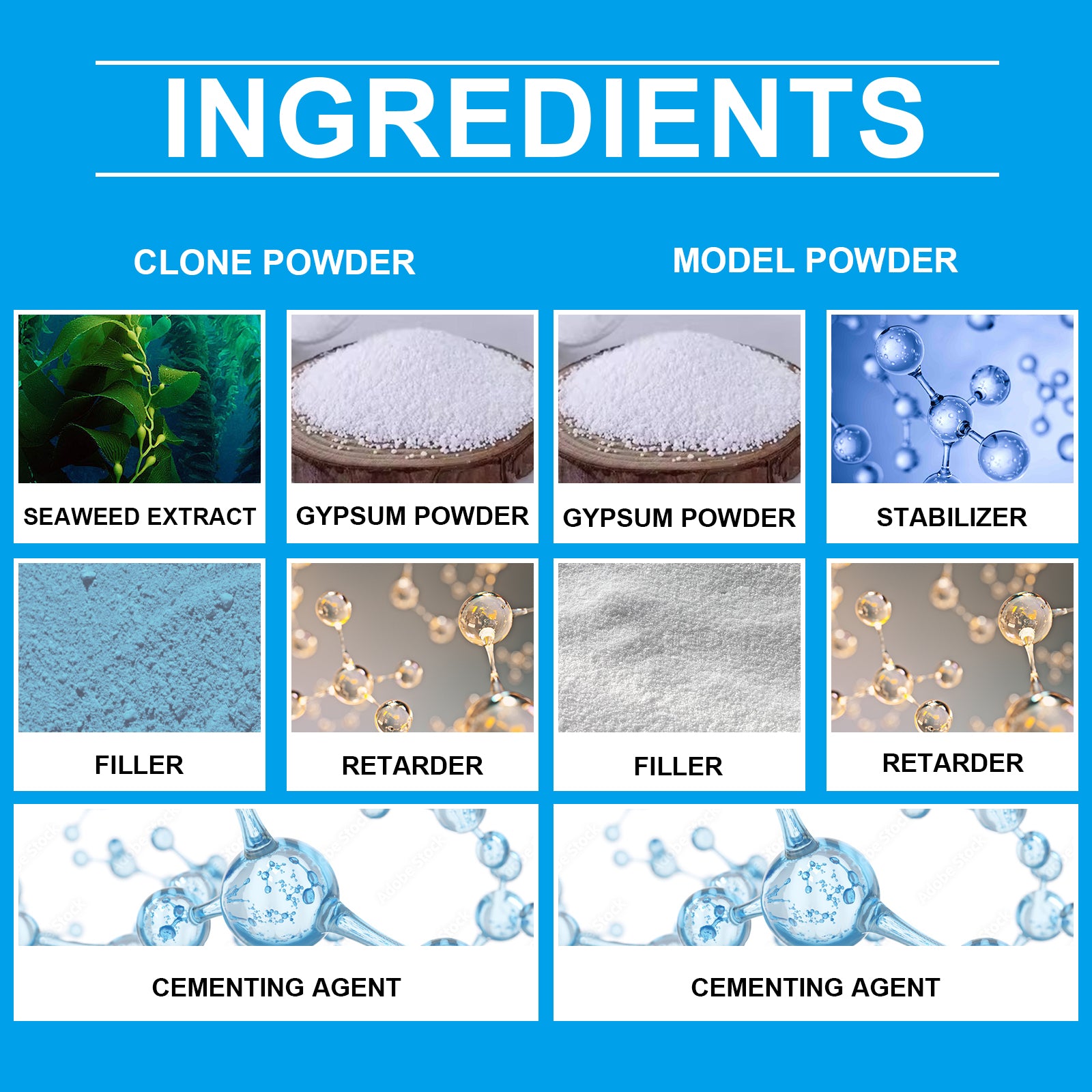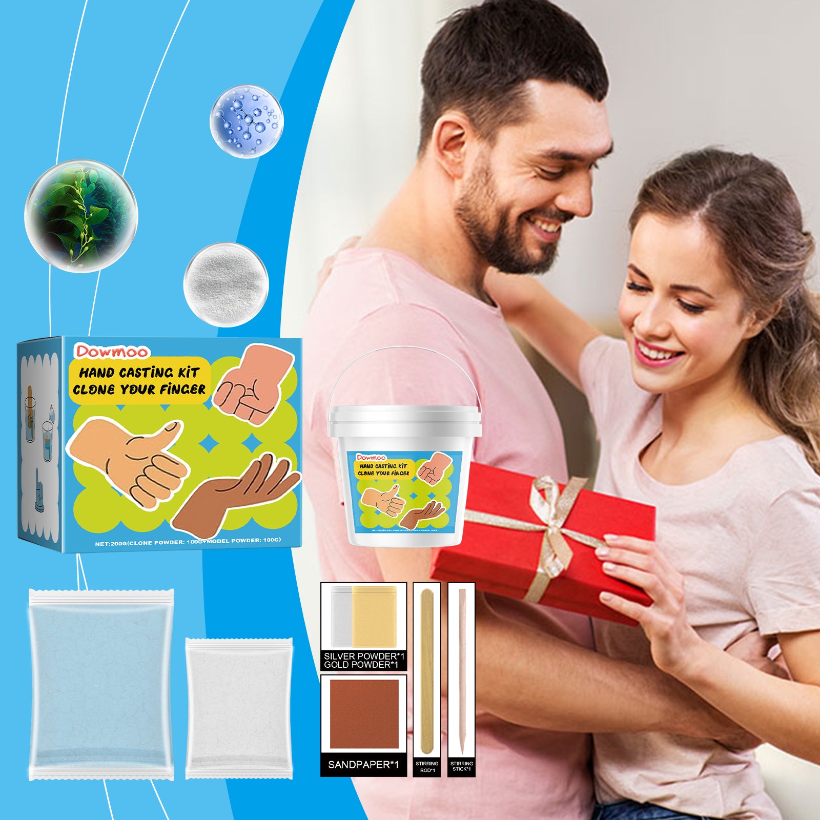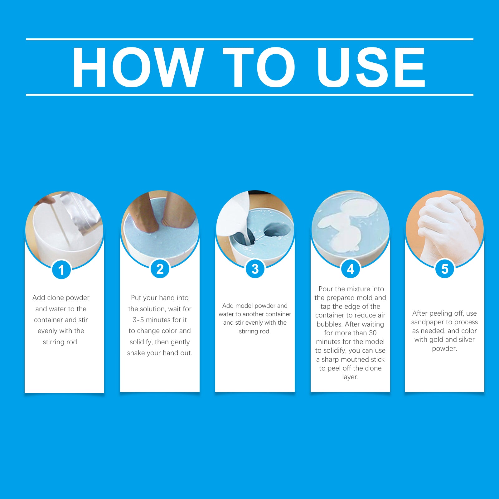 Our DIY hand casting kit contains clone powder: seaweed extract, gypsum powder; Model powder: binder, retarder. It can create lifelong memories for loved ones and immortalize your most touching moments. Its use is simple: Add the clone powder and water to the container, mix well with a mixing stick, dip your hand into the solution and wait 3-5 minutes for it to change color and set, then gently put your hand out, add the model powder and water to the other container, mix well with the mixing stick, pour the mixture into the prepared molds, Gently tap Rong ☆渟 shal 楀 barrier 嬢ㄉ to remove edges to reduce bubbles Wait for the model to solidified for more than 30 minutes, you can use a sharp stick to peel off the clone layer, after peeling, processing with sandpaper as needed, and color with gold and silver powder. And the operation is simple, easy to use.