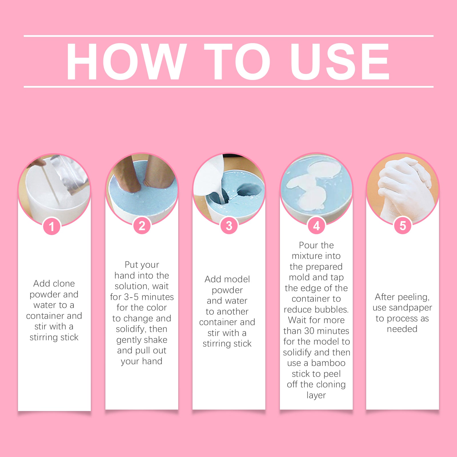 Our Valentine's Day couple hand modeling powder set contains cloning powder: seaweed extract, filler; model powder: gypsum powder, binder. The usage method is very simple: Add the cloning powder and water to a container, stir with a stirring rod, place your hand in the solution, wait for 3 to 5 minutes for the color to change and solidify, then gently shake and withdraw your hand. In another container, add model powder and water, stir with a stirring rod, pour the mixture into the prepared mold, tap the edge of the container to reduce air bubbles. Wait for more than 30 minutes for the model to solidify, then use a bamboo stick to peel off the cloning layer. After peeling off the skin, you can use sandpaper for processing as needed. And it can capture and retain every fine line and fingerprint, making each statue as lifelike as a hand-drawn one.