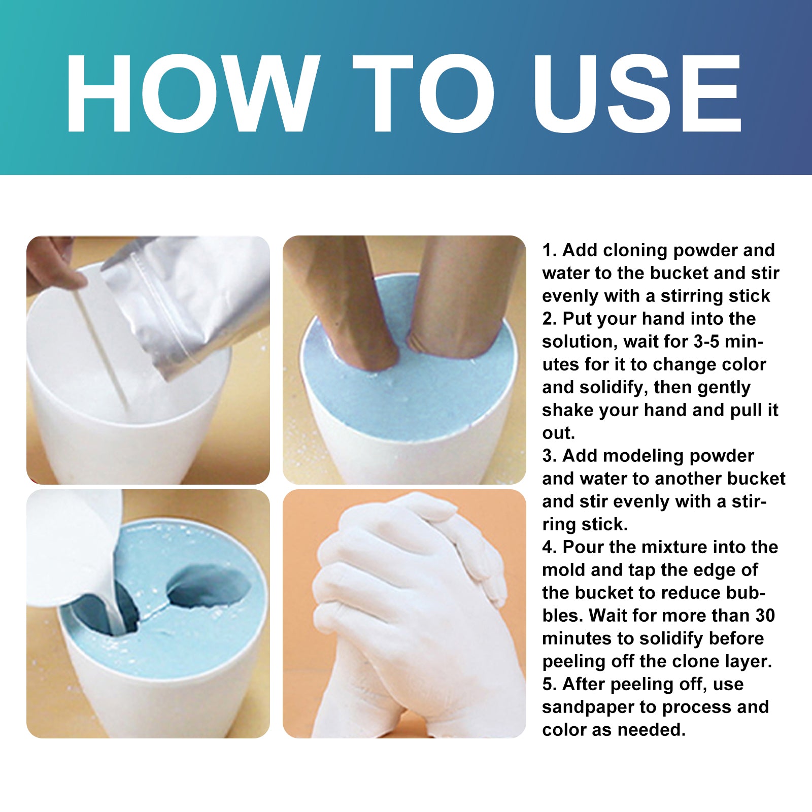 Our DIY plaster mold sculpture kit contains alginate, binder, retarder. It can record the growth process, fine capture every fine line and fingerprint, so that you create a more perfect product, is a kind of love witness. Its use method is very simple: add clone powder and water in a bucket, stir well with a mixing stick; Put your hand in the pot for about 5 minutes, until it has changed color and solidified, gently shake your hand and pull it out; In the other bucket, add the molding powder and water and mix well with a mixing stick. Pour the mixture into the mold, tapping the rim of the bucket to reduce air bubbles. Wait for more than 30 minutes to solidify and then peel off the clone layer; After peeling, work with sandpaper and color as needed. Perfect for teens, adults, couples and friends to create priceless memories together, It is also a great choice for gifts.