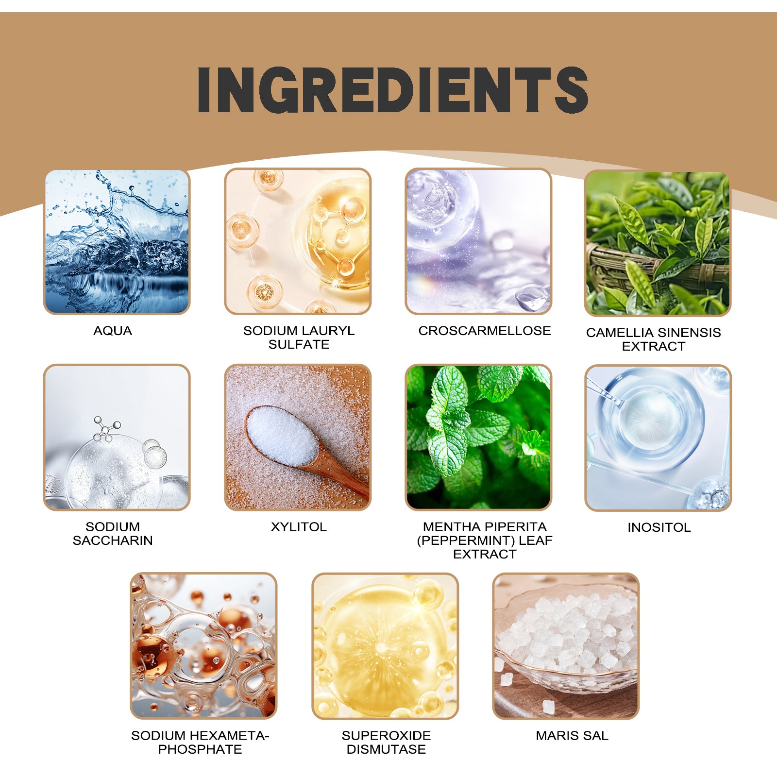 Our fresh-breath toothpaste contains xylitol and superoxide dismutase. It contains natural ingredients and can effectively and quickly remove stains caused by coffee, tea, wine and other substances over the years. Its usage method is very simple: 1. Take an appropriate amount of toothpaste and put it on the toothbrush. 2. Gently brush your teeth in circular motions from the inside out for 1 to 2 minutes. 3. Then rinse thoroughly with clean water. After use, it beautifies teeth, reduces odor and freshens breath.