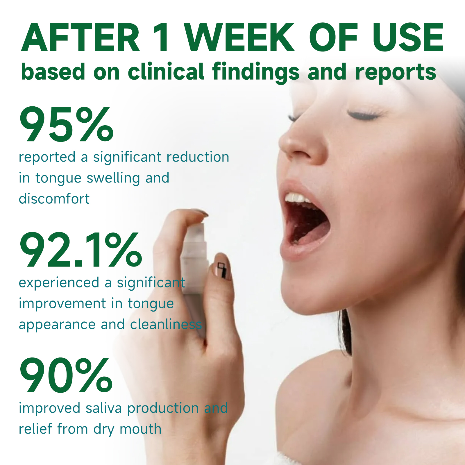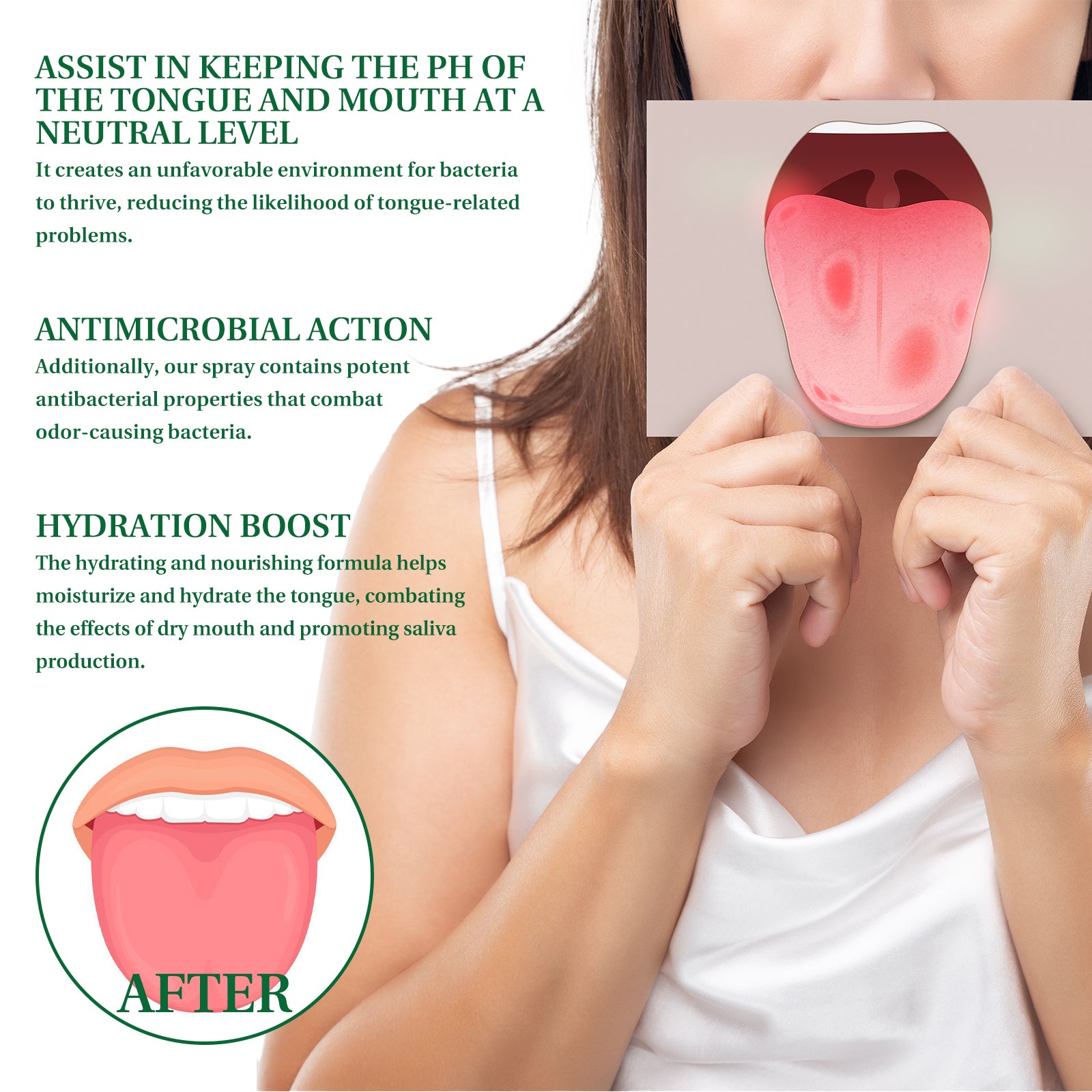 Our tongue repair spray contains peppermint extract, castor oil, lemon extract. It can improve saliva production and relieve dry mouth; The hydrating and nourishing formula helps to moisturize and moisturize the tongue, combat the effects of dry mouth and promote saliva production. Its use method is very simple: 1. Press 3 pumps to spray directly on the tongue or mouth; 2. Use it once every morning and evening to achieve better results. Keep your breath fresh, regulate your mouth ph, and prevent bacterial growth.