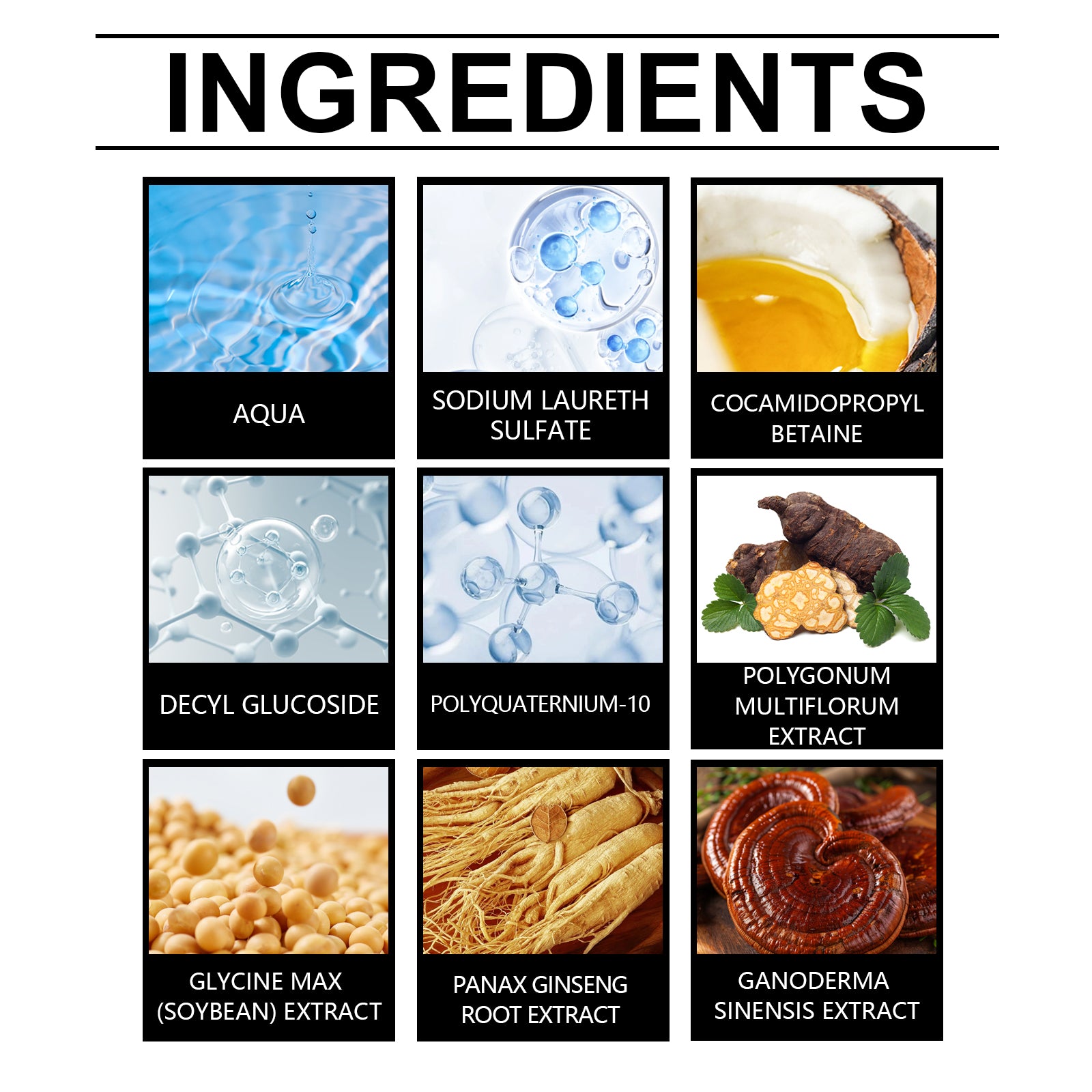 Our white to Black shampoo (Black) contains sodium lauryl polyether sulfate and cocamidopropyl betaine. It can reduce hair loss, enhance the overall hair density, and at the same time reduce the signs of hair loss, making the hair look thicker and fluffier. Its usage is very simple: First, thoroughly wet your hair with warm water. Then, take out the Polygonum multiflorum shampoo and apply it to your scalp. Rub it into rich foam and massage the hair roots and scalp for 2 to 3 minutes. Finally, rinse off the foam with clean water. It can also enhance the overall hair density, nourish and solidify the hair roots, making the hair darker and thicker.
