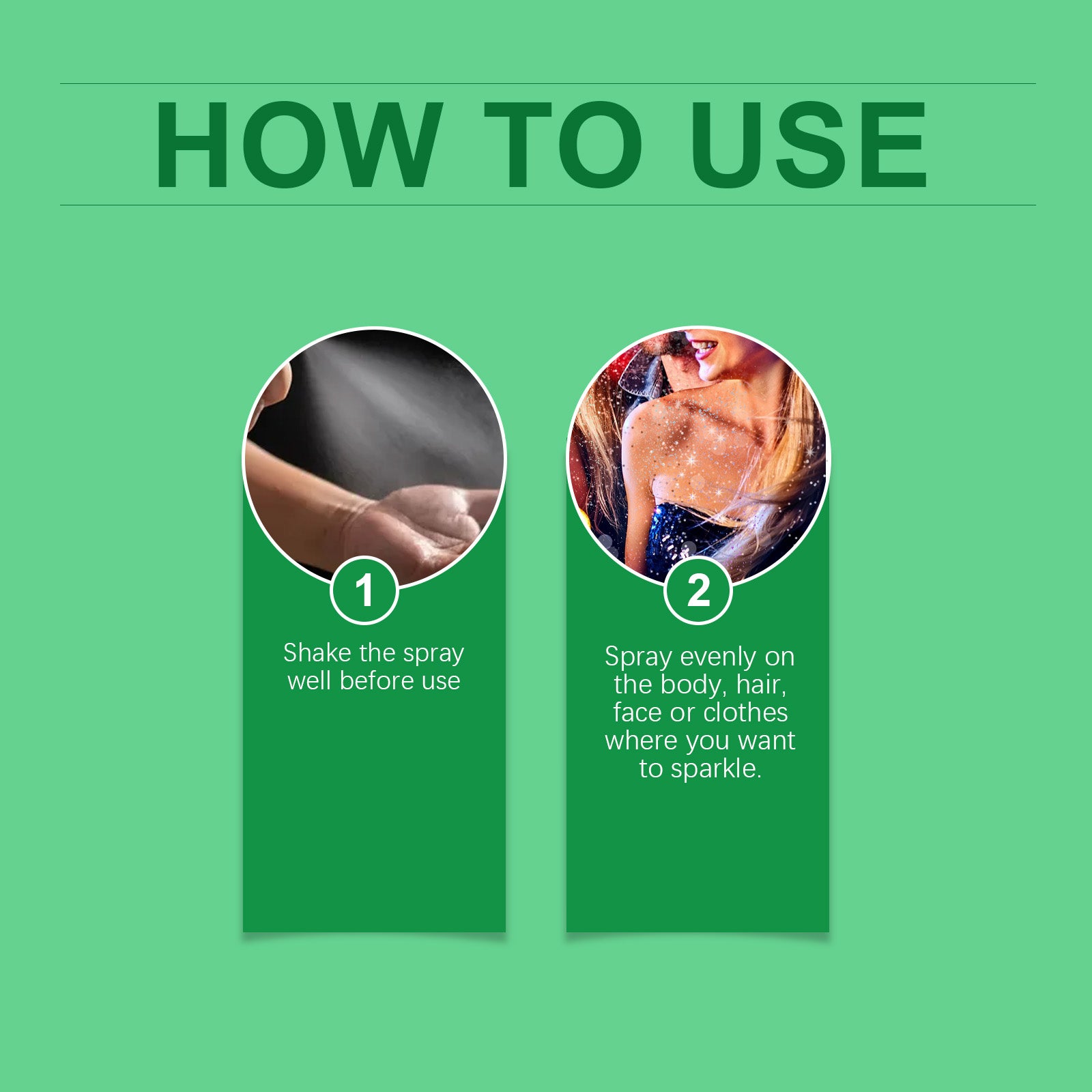 Our color brightening flash spray contains mica and tocopherol. It can make you sparkle and make you shine at costume parties, festivals or birthday parties. How to apply it is simple: Shake the spray before application and spray it evenly on your body, hair, face, or clothes where you want to shine. And can instantly improve the skin shine, give a charming shiny effect, suitable for various occasions.