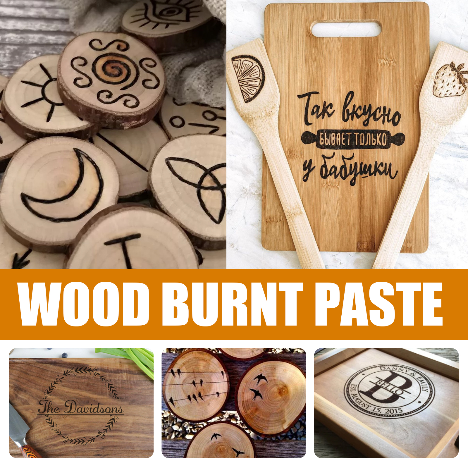 Our wood burning paste contains linseed oil, beeswax, and iron oxide. It can burn quickly, help you shape the pattern you want, the material is non-toxic, easy to use, suitable for wooden coasters, wooden signs, cardboard, decorations, cutting boards, etc. Its use method is very simple: first use sand to smooth the wood, wipe off the dust, fix the cut pattern template paper on the wood, then use a brush or scraper to evenly apply the product on the template paper, and then wipe off the excess paste with paper, and then tear off the template paper, heat with a heat gun, and shape the pattern. After use, it quickly helps you shape the ideal pattern, and the effect is lasting.