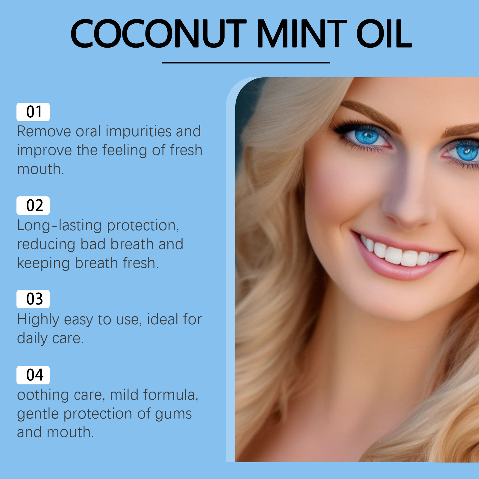 Our Coconut Mint Oil contains Cocos Nucifera(Coconut)Fruit Extract, Mentha Haplocalx Extract, Ascorbic Acid. It can quickly relieve oral discomfort and restore oral comfort. Strengthens tooth surface, reduces sensitivity issues, strengthens gum health, improves overall oral health, enhances tooth brightness, improves stain, protects vitamins, fights free radicals, and delays signs of aging. Its use method is very simple: take a proper amount of mouthwash for 2-3 minutes, spit out the mouthwash after brushing your teeth, scrape your tongue with a tongue scraper, and finally rinse your mouth with water. Double vitamin protection, fight free radicals, delay signs of aging, and quickly relieve oral discomfort.